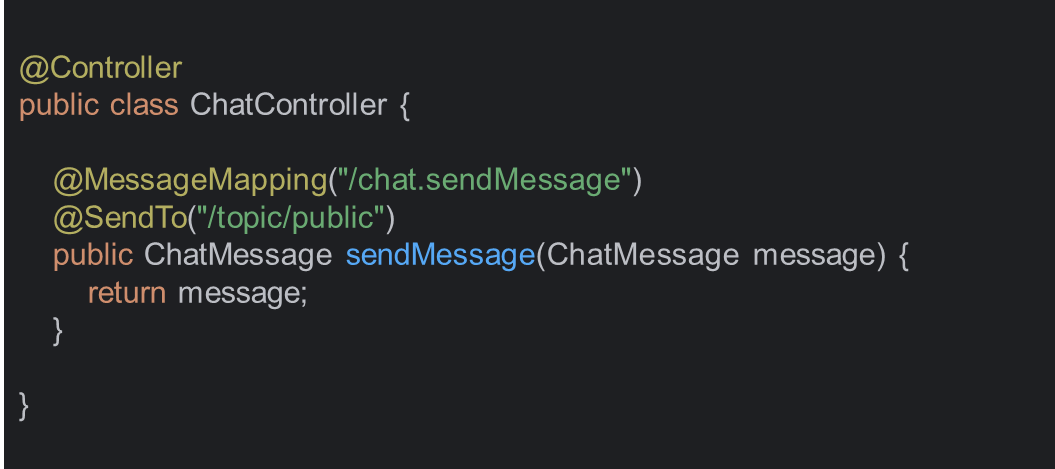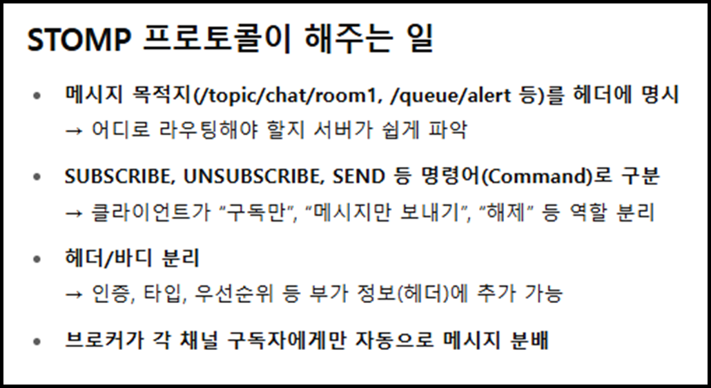 특징 : 채팅방(채널) 구분, 구독/발행, 메시지 라우팅을 STOMP에서 자동 처리
