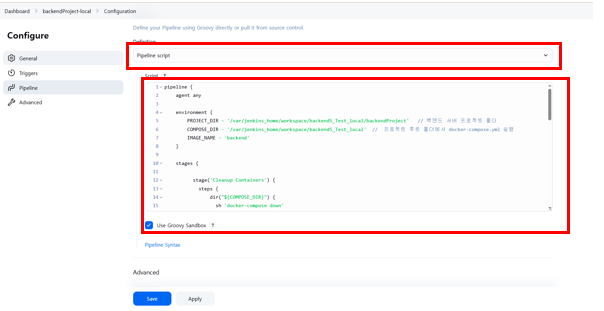 로컬에서 실행할 파이프라인 스크립트 복붙하면 된다.