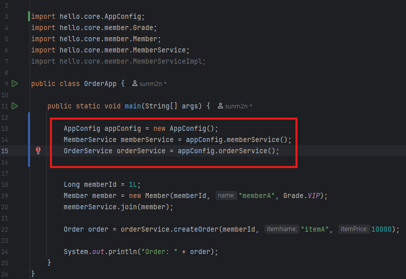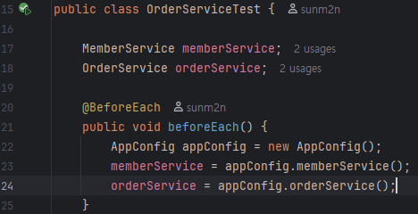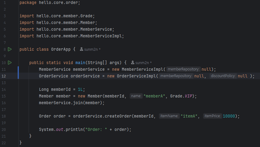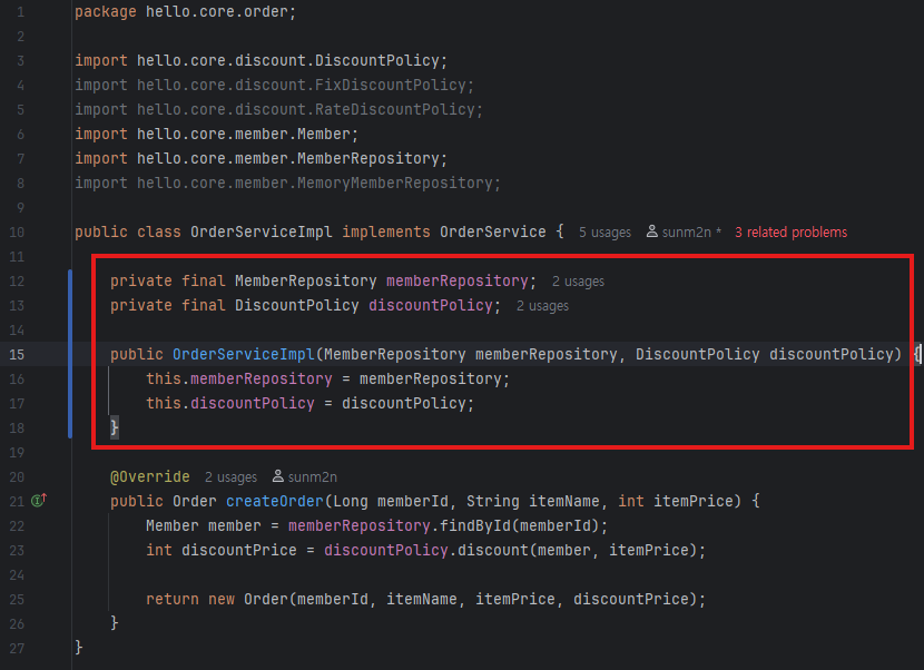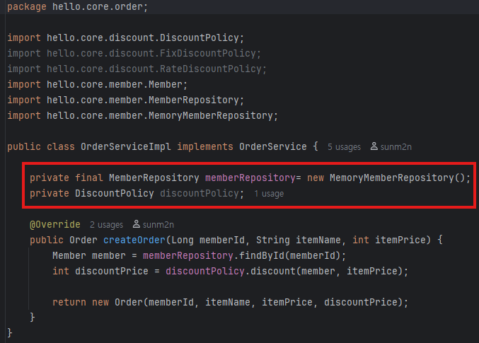 OrderServiceImpl` 에는 MemoryMemberRepository, FixDiscountPolicy 객체의 의존관계가 주입된다.