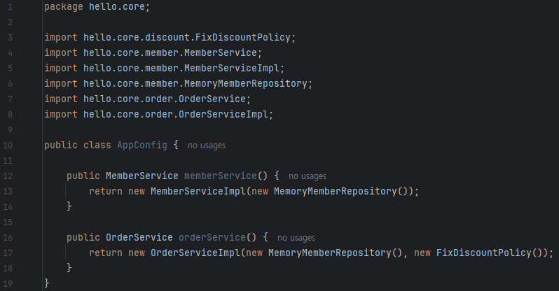 애플리케이션의 전체 동작 방식을 구성(config)하기 위해, 구현 객체를 생성하고, 연결하는 책임을 가지는 별도의 설정 클래스를 만들자.