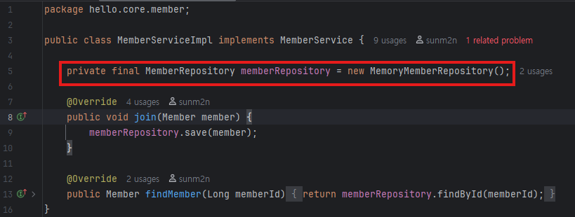 설계 변경으로 단지 MemberServiceImpl 은 MemberMemberRepository 를 의존하지 않는다.