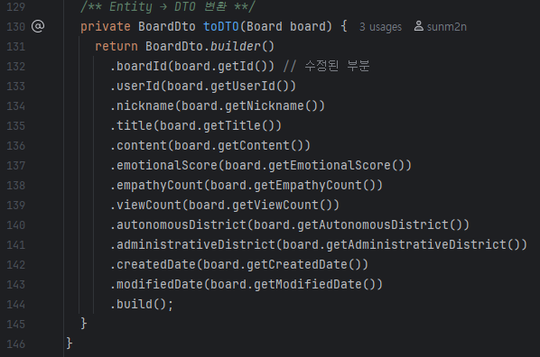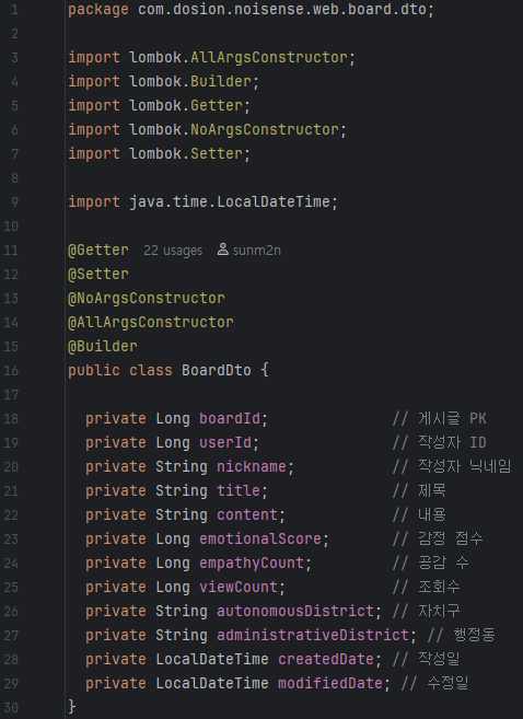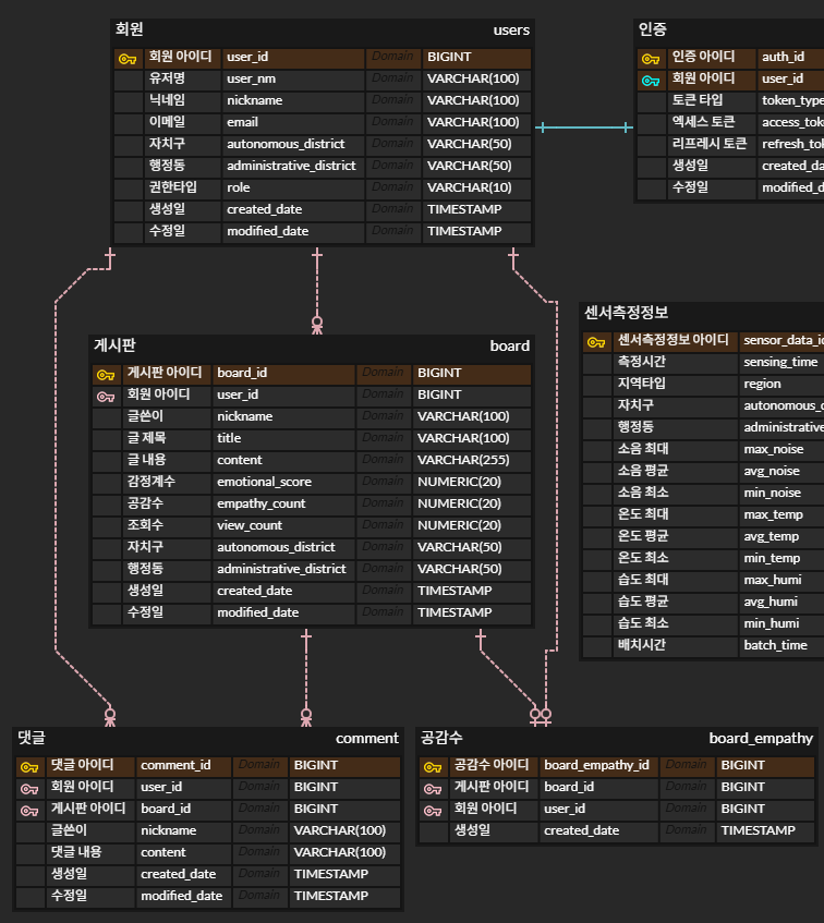 여기서 먼저 유저 정보가 바뀌더라도 게시글에는 따로 영향을 주지 않게 하려고 board 테이블에도 별도로 저장하도록 설계하였다.
