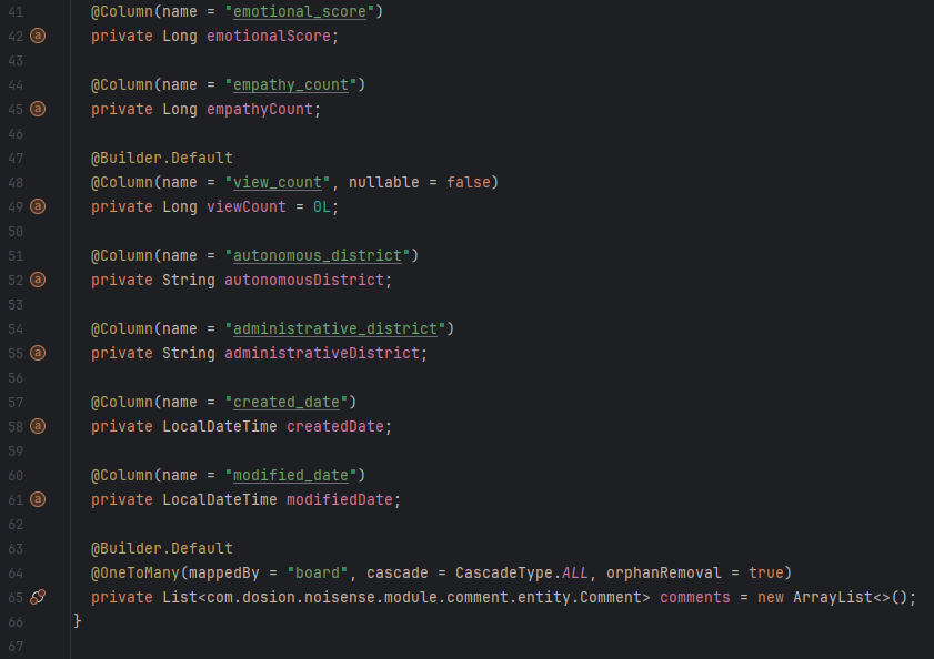 여기서 @Builder.Default 이 어노테이션을 쓴 이유는 처음에는 그냥 실행시켰더니 초기값이 무시되고 null로 초기화가 되었다.